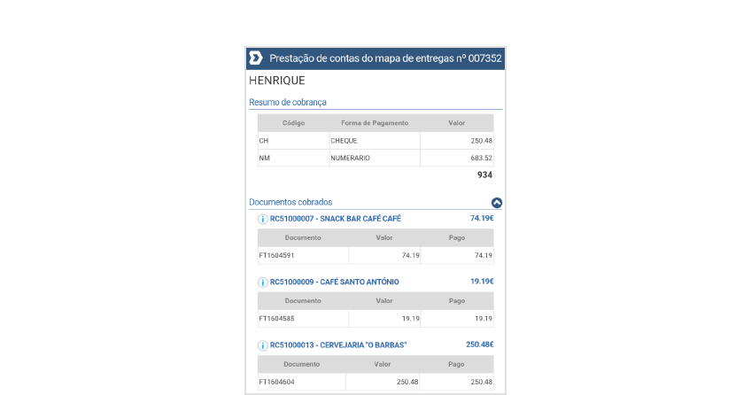 Para facilitar o fechamento do dia, o aplicativo permite emitir automaticamente a prestação de contas onde são evidenciadas as entregas, as não entregas e os valores cobrados.