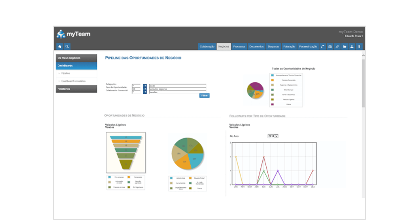 A gestão das oportunidades de negócio parametriza as áreas de negócio, as fases para acompanhar e concluir cada negócio, comunicando os registos ao gestor que promove o sucesso.